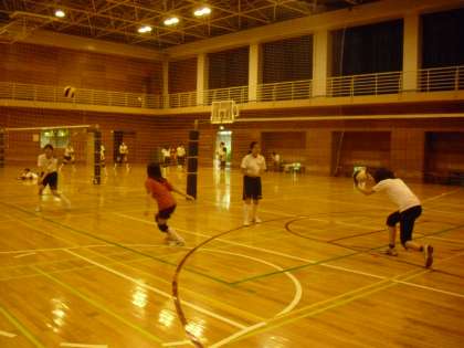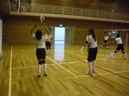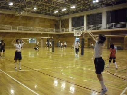 サマーワークショップ第2回目の「バレーボール教室」の様子です。中学生とペアになってレシーブやトスの練習をしています。