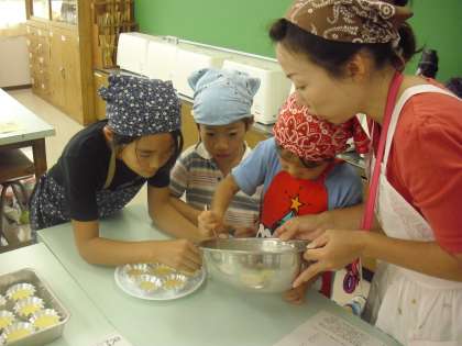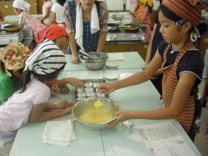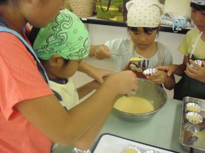 講師が説明しながら作った生地をグループに分け、各自がスプーンで生地をカップの中に入れました。こぼさないように慎重に入れています。