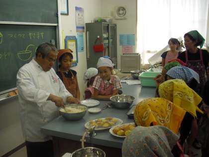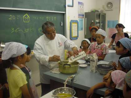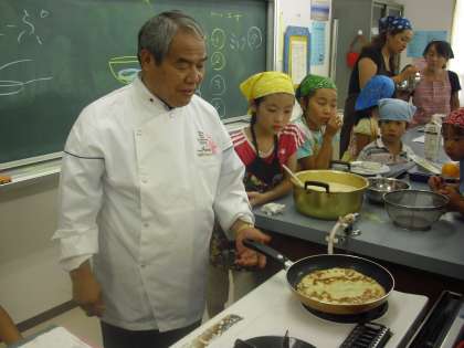 2品目はクレープです。講師の先生が、生地の作り方を説明しながら作っているところです。子どもたちは話を聞きながら先生の技術に注目しています。