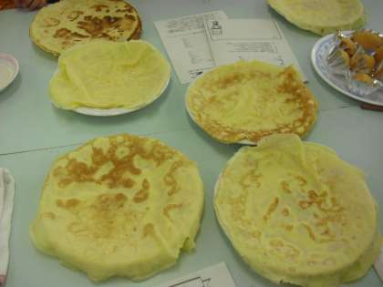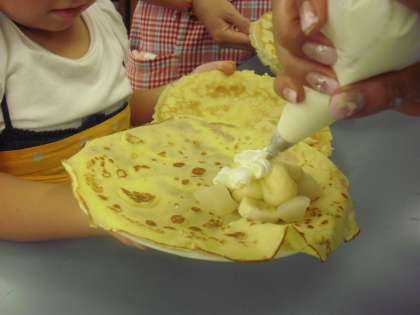 焼きあがった生地を持って、フルーツをトッピングしてもらいます。そこに2種類のクリームを加えてできあがりです。