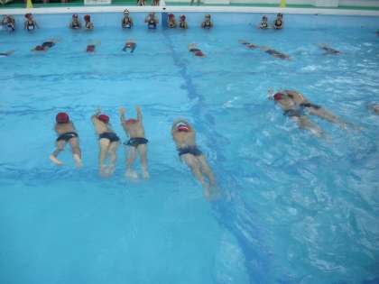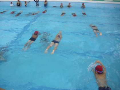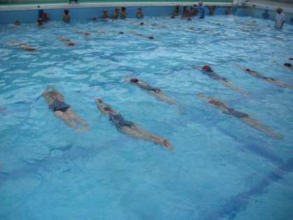 中学年の水泳教室の様子です。中学年は浮く・泳ぐ運動に取り組んでいます。けのびの練習をしています。体を真っ直ぐに伸ばして浮いています。