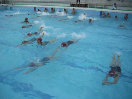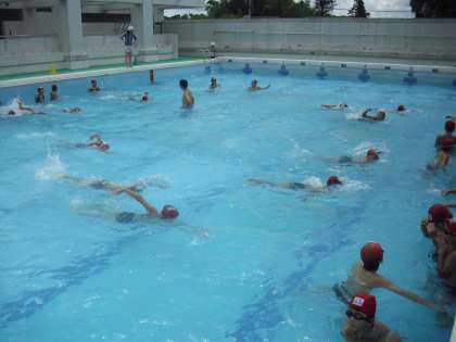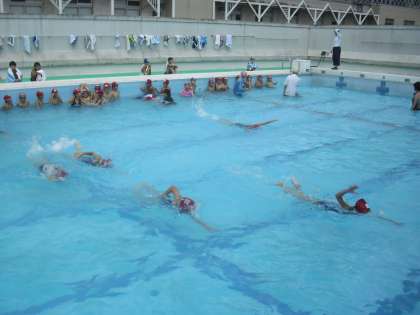 けのびからばた足、クロールの練習をしているところです。ばた足は膝を折らずにももの付け根から動かすことがポイントです。基本的な動きを習得するために繰り返し練習します。