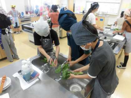 7月9日(金)3・4校時、家庭科室では、5年3組が2グループに分かれて調理実習「青菜のおひたし」を作っていました。