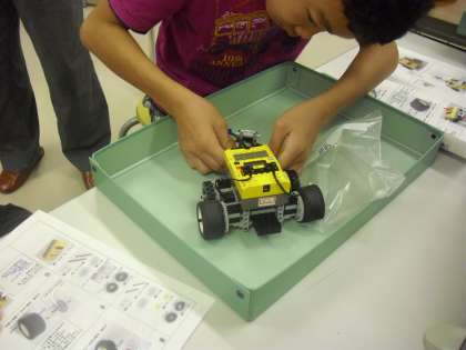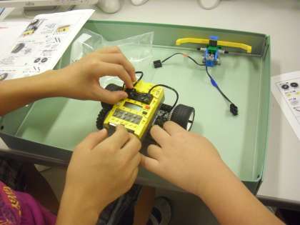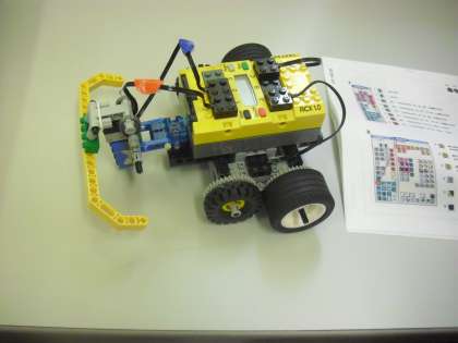 車型のロボットの完成です。予想より短い時間でできあがりました。カブトムシの角のような部分はセンサーになっています。