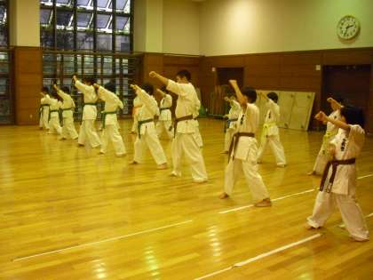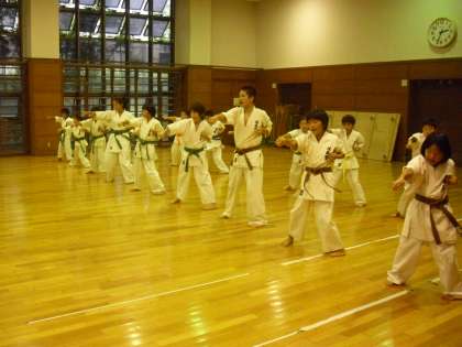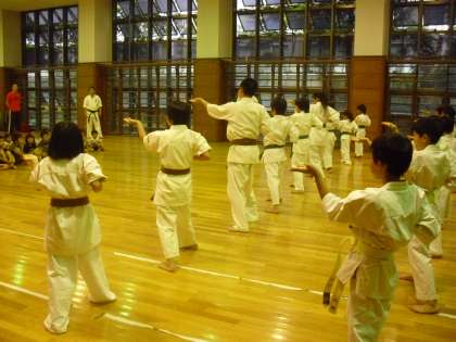 空手部員の子どもたちに見本の型を披露してもらいます。今日、取り組むつきや蹴りを見せてもらいました。