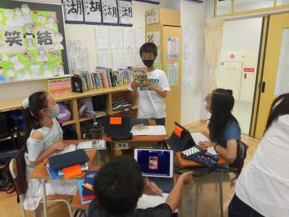 本だけではなく、タブレットも活用しながら、ブックトークのための資料を作り、グループの友達に発表していました。