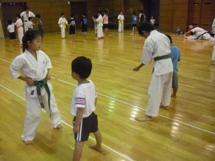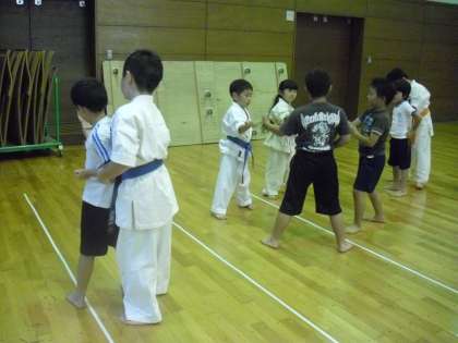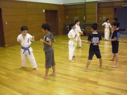 空手部員の子どもたちは、構え方のひじや肩の高さや足の向きなど、細かなところまで丁寧に教えていました。