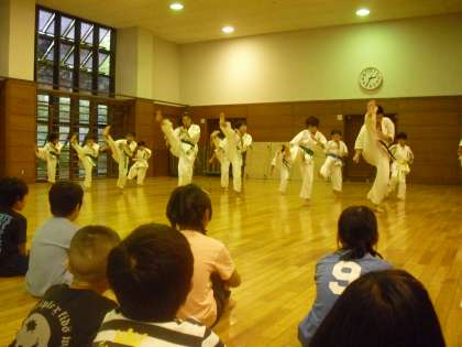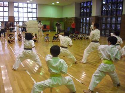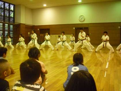 もう一度、空手部員の型を見て復習です。力強く流れるような演武は、初めて参加する子どもたちにとっては迫力があります。