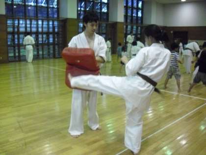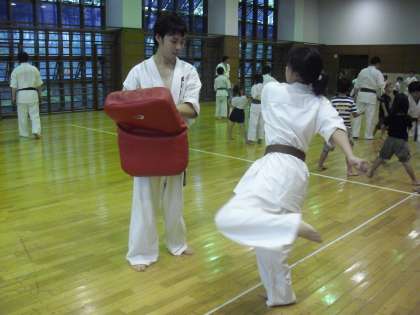 ミットにめがけてケリを打ちこむ練習の様子です。保護者の方のなかにも体験していた人がいました。