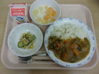 1学期の給食最終日を迎えました。「夏野菜のカレーライス」は、年に1回だけ、この時期に登場する料理です。各種夏野菜は大きめにカットし、形が残るように注意しながら仕上げました。野菜好きにはたまらない、満足感のあるカレーでしたね。