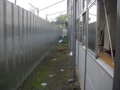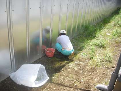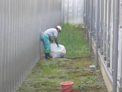 主事さんが仮設校舎とフェンスの間の草むしりをしているところです。暑い中、大変な作業ですが、2学期のスタートに向けて環境整備が進んでいます。
