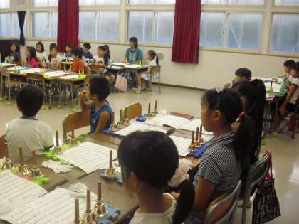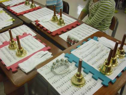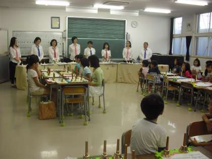 サマーワークショップ「ミュージックベルを演奏してみよう」の様子です。講師の先生方とあいさつをし、講座の説明を聞いているところです。