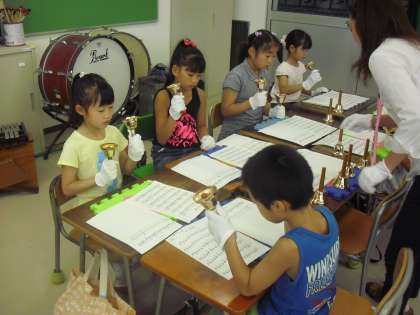 練習した成果をグループ毎に発表します。1年生は「きらきらぼし」、2年生は「ドレミの歌」、3年生は「聖者の行進」、4年生以上は「ミッキーマウスマーチ」です。
