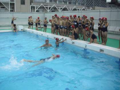 6年生の体育の授業の様子です。水泳記録会に向けて友達と互いの記録を計測し合っています。自己記録更新を目指して、泳ぎ込みました。