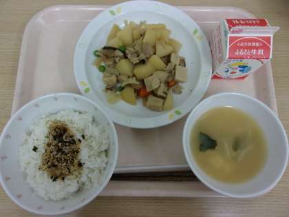 本日からしばらくは分散登校のため、各クラスの給食当番も3〜4人と少人数の体制です。役割分担を素早くして、手際よく盛り付けていました。また、配膳を待っている間、静かに座っている姿に安心しました。