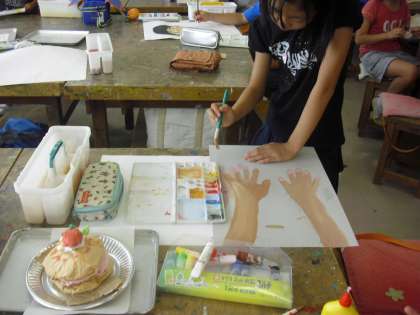 4年生の図画工作の授業の様子です。「わ!おいしそう」の制作に取り組んでいるところです。食べ物を持つ自分を鏡を覗きながら描いています。