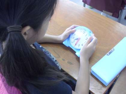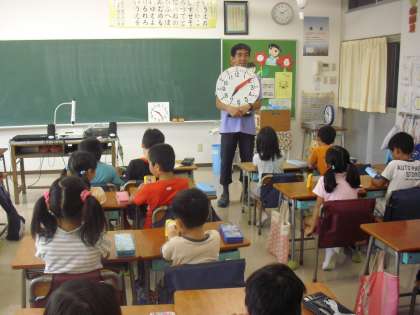 1年生の算数の授業の様子です。時計を使った時刻の学習をしています。自分たちの生活を振り返りながら、各自が時計の針を時刻に合わせていきました。