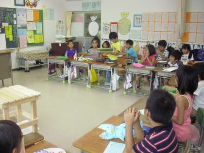 2年生の学級活動の授業の様子です。夏休みの自由研究を紹介し合っているところです。工夫したところや難しかったところなどを付け加えて話していました。