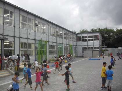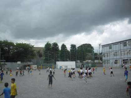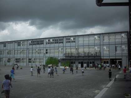 休み時間の様子です。子どもたちは元気に遊んでいます。空を見上げると黒い雲が迫ってきました。台風の影響でしょうか。子どもたちが無事に下校するまで、雨が降らないことを祈ります。