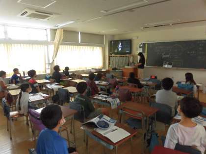 先生の話を興味をもって聞く4年生。とてもかわいいです。