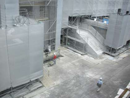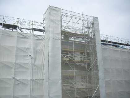 現在の工事の様子です。1階から4階までは工事用のリフトで資材等を運びます。今日は風が強いので、安全に工事が進むことを願っています。