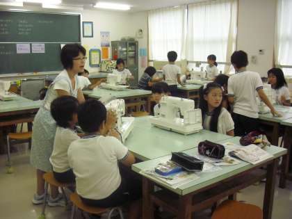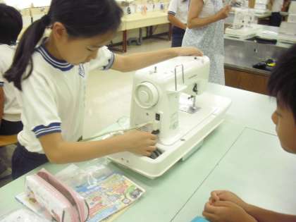 5年生の家庭科の授業の様子です。初めてミシンを使った学習をします。ケースからとり出し、安全を確認しながらミシンをセットする練習をしました。