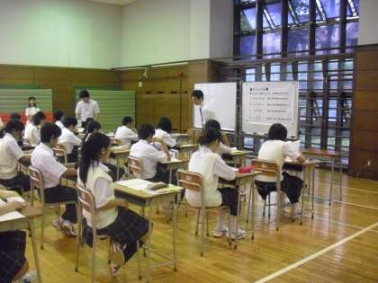 芦花中学校の研究発表会の数学の公開授業の様子です。格技室で行った1年生の「1次方程式」の公開授業です。芦花中学校は、数学的な表現力を高める研究をしてきました。