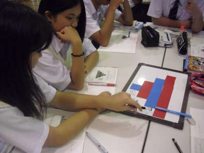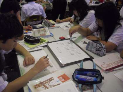 具体物を使って考えを述べたり、ホワイトボードに考えを書き出したりしながら、自分の考えを友達に伝えていきます。友達の発表に拍手がわき起こる場面ありました。