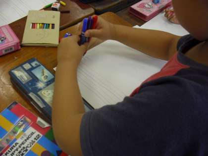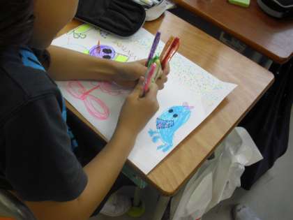 3年生の図画工作の授業の様子です。「線」で絵を描いているところです。線の描き方や太さ、数、色などの工夫を楽しみながら描いています。