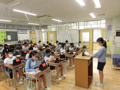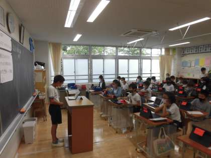 子供たちは、東京2020オリンピック・パラリンピック競技大会を見て、自分自身が感動した場面についてタブレットを使って発表しました。
