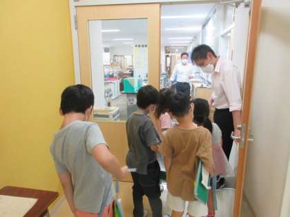 子供たちは、実際に校長室や保健室、体育館などの教室を回り、何をする教室なのか意見を出し合いました。