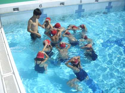 1年生の体育の授業の様子です。プールで検定を行っているところです。担任で手分けをして、丁寧に行っています。1年生もがんばっていました。