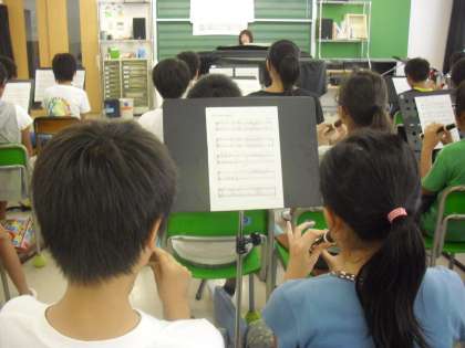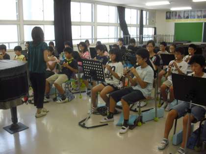 6年生の音楽の授業の様子です。「ジャーマン・ジャズ」という曲をリコーダーで演奏しているところです。音譜の音の長さを読み取って演奏することを意識させています。