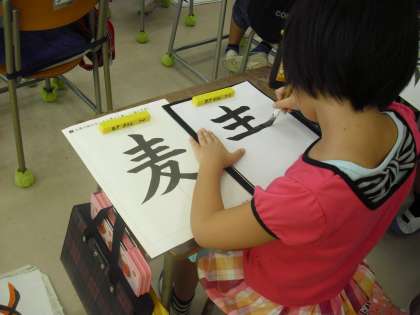 4年生の書写の授業の様子です。課題文字は「麦」です。筆順、とめ、はらいに気を付けながら書いています。集中しているので教室が静かです。