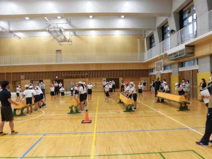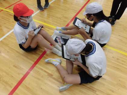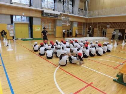 子供たちは、3人グループで技を見合い、「もっと腕を伸ばして!」「目線を高くしよう。」などと声をかけ合い、うまくいったときは「できた!」と喜び合う姿がありました。子供たちみんなで「できた」を増やそう高め合っていました。