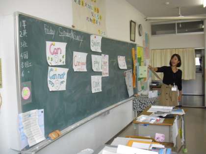 6年生の外国語活動の授業の様子です。英語活動支援員と担任によるTTで授業を進めています。支援員の先生の発音を真似ながら英語に親しみます。