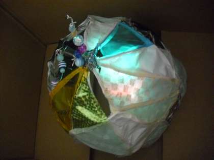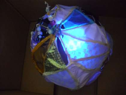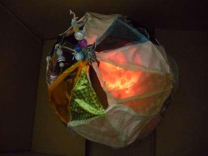 ほぼ完成した作品を色の変化するライトにかぶせてみると、きれいな幻灯に。まさに「光のファンタジー」です。