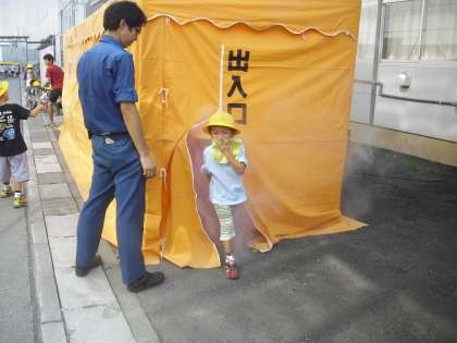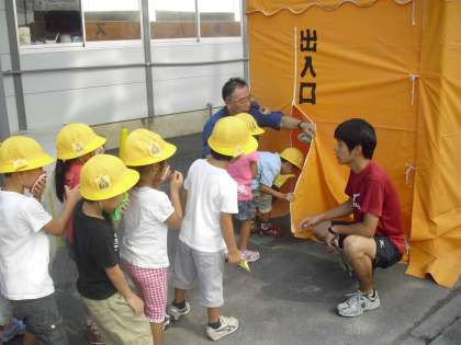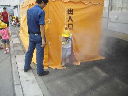 1年生の煙ハウス体験の様子です。煙を直接吸い込まないようにハンカチを口に当てて身を低くして煙の中を進みます。