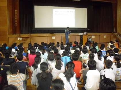 5・6年生が消防署の講話を聞いている様子です。東日本大震災にかかわる内容でした。子どもたちは真剣な表情で話を聞いていました。