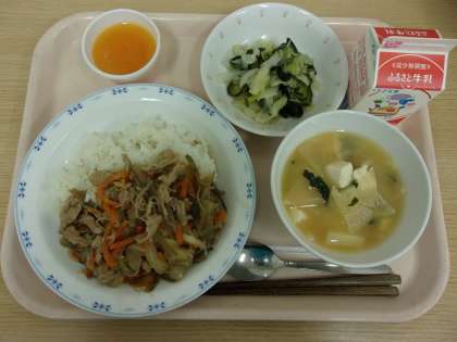 米(茨城)、押麦(福井・富山)、豚肉(北海道)、豆腐(東京)、しらたき・キャベツ(群馬)、カットわかめ(韓国)、粉寒天(南米・地中海)、オレンジジュース・小松菜(茨城)、しょうが(高知)、ごぼう・ねぎ・大根(青森)、にんじん・たまねぎ・じゃがいも(北海道)、きゅうり(長野)