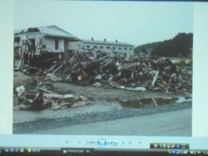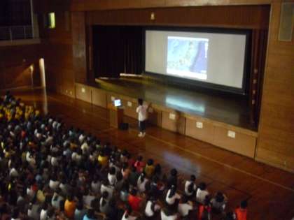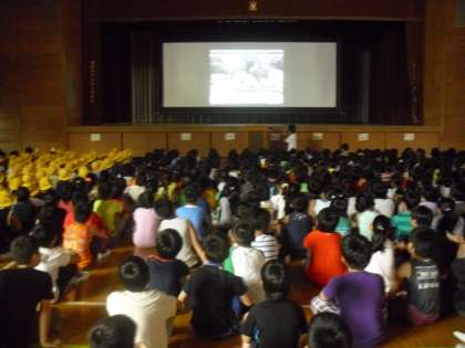 全校朝会の様子です。夏休みを利用して、被災地(宮城県)でボランティア活動を行った岡光先生の話を聞きました。自分の目で見て、行動した人の話は説得力があります。子どもたちは真剣に聞いていました。