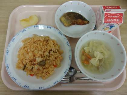 米(茨城)、鶏肉・豚肉(北海道)、冷凍鶏ガラ(神奈川)、シイラ(長崎)、ひよこ豆・トマトジュース(アメリカ)、マカロニ(イタリア)、マッシュルーム水煮(岡山)、冷凍グリンピース(ニュージーランド)、たまねぎ・にんじん(北海道)、にんにく・りんご(青森)、キャベツ(群馬)、パセリ(茨城)