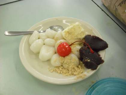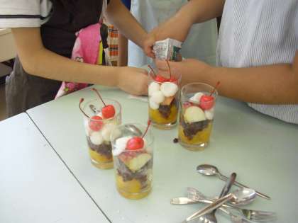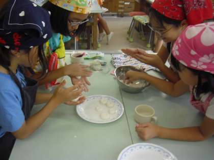 料理クラブの活動の様子です。白玉団子を使ったデザートを作っているところです。果物と組み合わせておいしそうです。