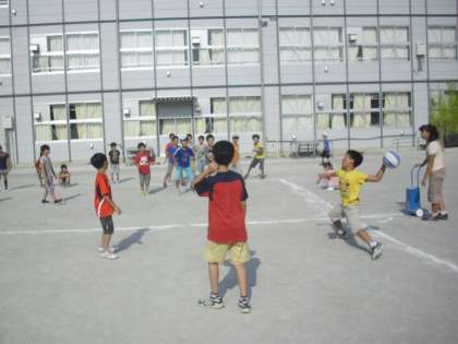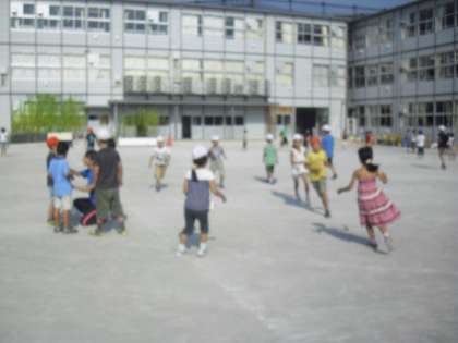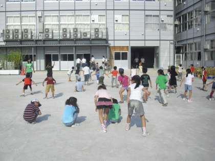 今朝の学級遊び「みんなでたのしく」の様子です。校庭は2年生と4年生が遊んでいます。クラス毎に先生もいっしょになって遊んでいました。