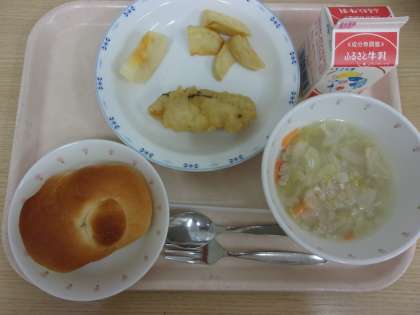 今日は「イギリス料理」を取り入れた給食です。伝統的な料理「フィッシュ&チップス」は、白身魚のホキで作りました。衣がカリッサクッとなるように、いつもの天ぷらとは異なる材料を使いました。