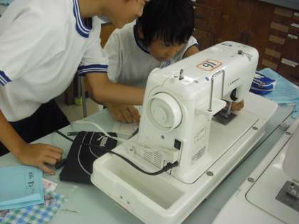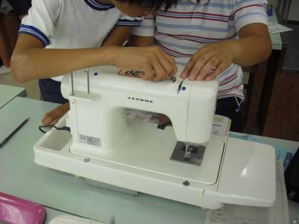 5年生の家庭科の授業の様子です。ミシンの学習で、糸の通り道の確認をしているところです。教科書と見比べながら確認しています。