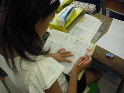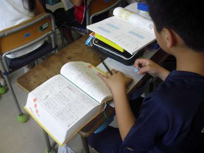 4年生の国語の授業の様子です。漢字辞典を使って漢字二文字の熟語の意味を調べ、ワークシートに記入しているところです。辞典の引き方もしっかり身に付けます。