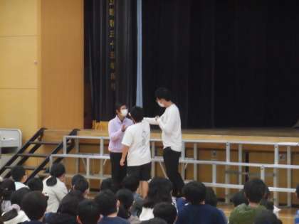 薬剤師さんから、薬物乱用とは何か、薬物の恐ろしさについて話を聞きました。3名の児童が代表として、薬物使用に誘われたときに断るシミュレーションを行った際には、「ぼくはやりません。」「大丈夫です。」ときっぱりと断ることができていました。