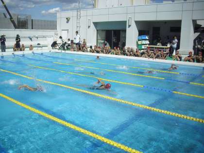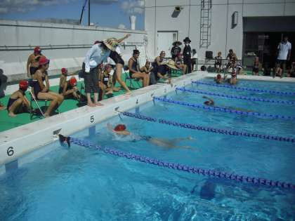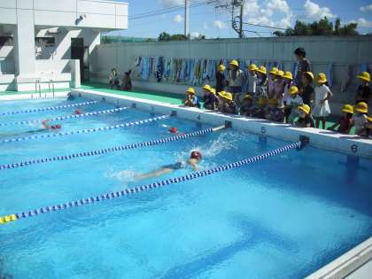 自分のベストを目指してがんばる6年生。夏のような日差しの中、力強い泳ぎが続きます。