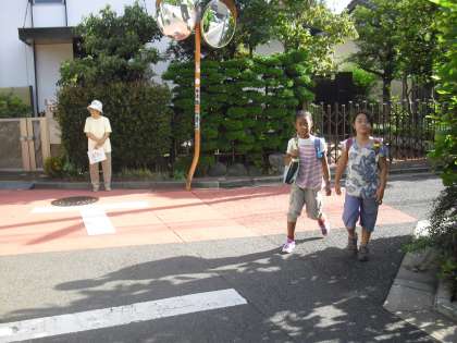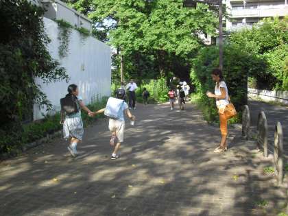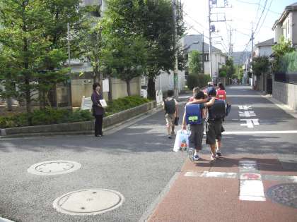 今朝のあいさつキャンペーンの様子です。今日が最終日となりました。上から南烏山1丁目15番付近、郵政宿舎前、遊歩道です。サポーターカードを持った地域サポーターの方が子どもたちを見守っています。